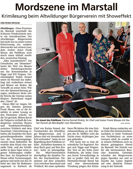Auch die WLZ berichtet von unserer mordsmäßigen Autorenlesung mit Frank Mause im Marstall und sorgte mit der Inszenierung der Anfangsszene für einen Showeffekt.